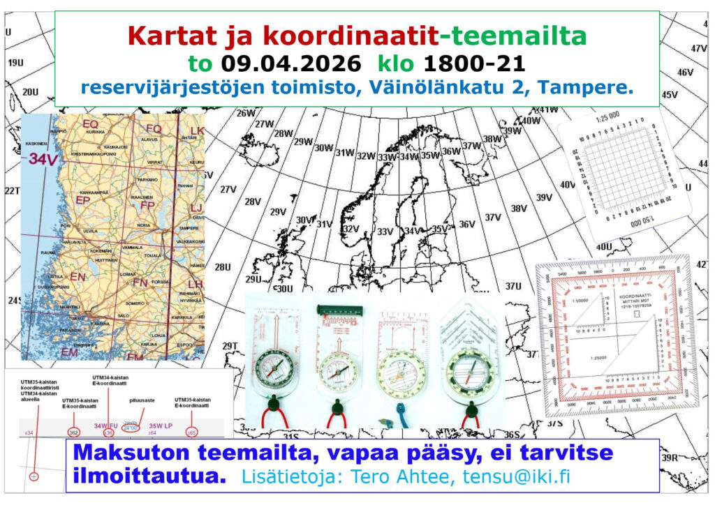 TARKOITUS: Teemaillan aikana opetellaan ja harjoitellaan paikantamista 1:25000 koordinaatistoissa (MGRS ja UTM34), eli koordinaattien lukemista ja kirjoittamista peruskartan ”punaisella ruudukolla”. Aiheena ovat siis nykyiset vihreäkantiset EUREF-FIN peruskartat ja vastaavat harjoitusaluekartat. Myös viranomaismuotoista maantieteellistä esitysmuotoa käsitellään lyhyesti (WGS84).