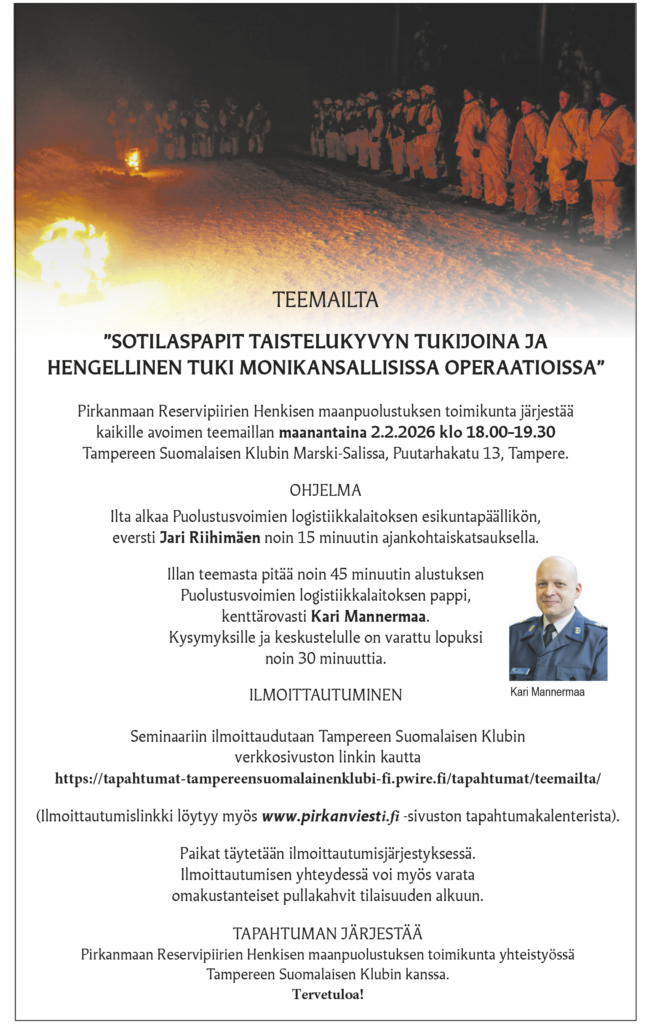 Pirkanmaan Reservipiirien Henkisen maanpuolustuksen toimikunta järjestää yhteistyössä Tampereen Suomalaisen Klubin kanssa Teemaillan ”Sotilaspapit taistelukyvyn tukijoina ja hengellinen tuki monikansallisissa operaatioissa”.